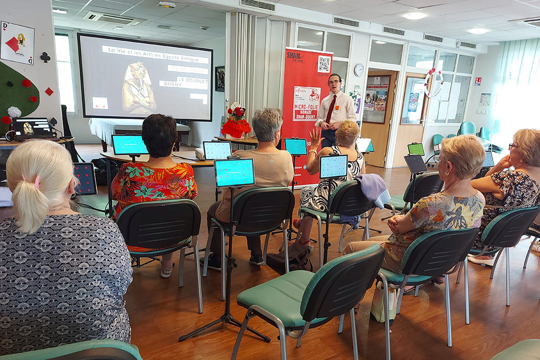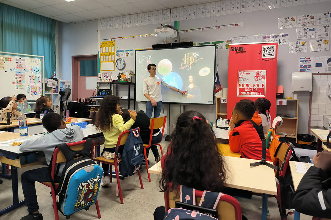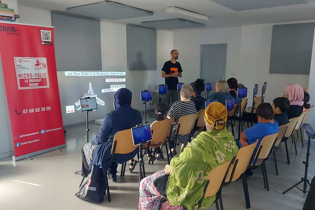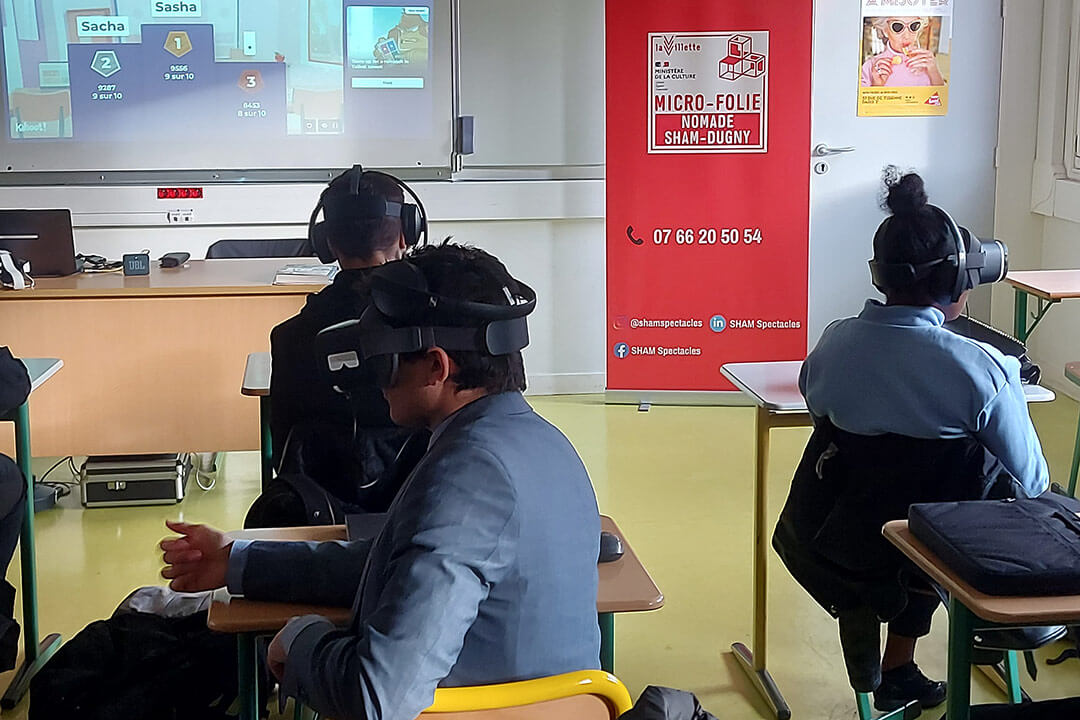 Nous portons trois Micro-Folies dans un format nomade : Le Bourget, Dugny et le Val-d’Oise. En quelques minutes, le musée numérique et les casques de réalité virtuelle s’installent dans les classes, centres sociaux, EHPAD, médiathèques ou même en plein air sous des tentes opaques.